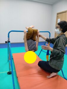 コウモリ足抜き回りは、コウモリでぶら下がった後、くるりと回って着地します。両足を揃えて着地できるとカッコいいです。