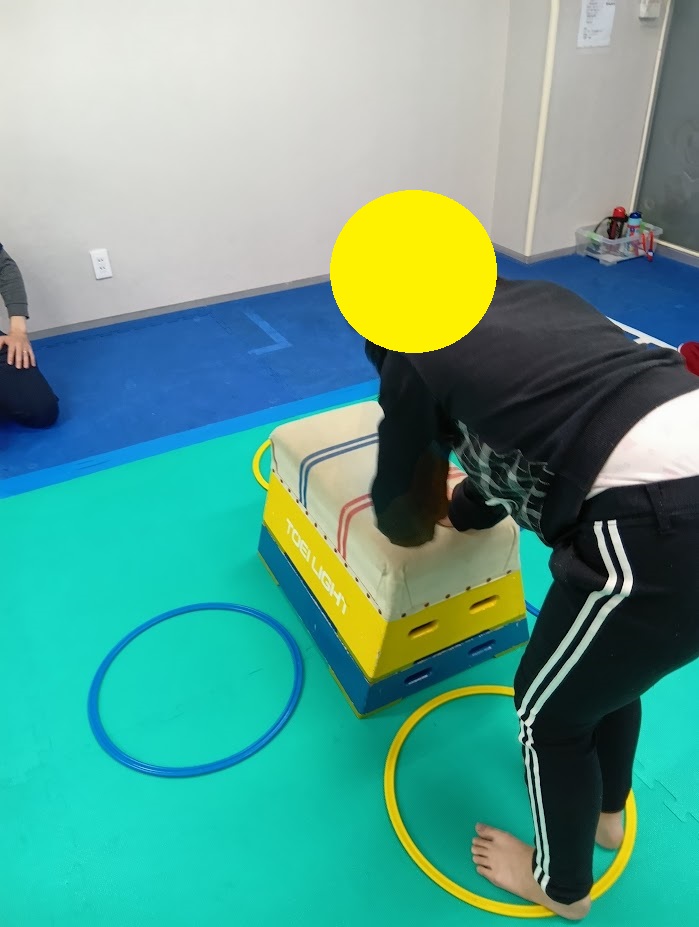 跳び箱一周跳びは、跳び箱に手を着いたまま時計回りにジャンプをして跳び箱の周りを一周します。腰を高く上げてジャンプするのがポイントです。