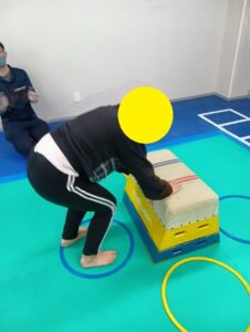 お便りをはさんで小波跳びは、足にお便りをはさみ落とさないように小波を10回ジャンプします。赤い四角の中からはみ出さないように跳ぶことも大切です。